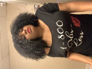 Black fitted tee with script stating “1-800-His Loss” in white sparkly letters with red heart shaped lips (kiss) next to the script. Available in black and white.