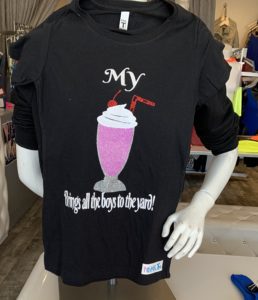 Fitted sparkly Milkshake tee. This product may be ordered in a black or white shirt. Please view all 3 photos in the product gallery for clarity in both colors.
